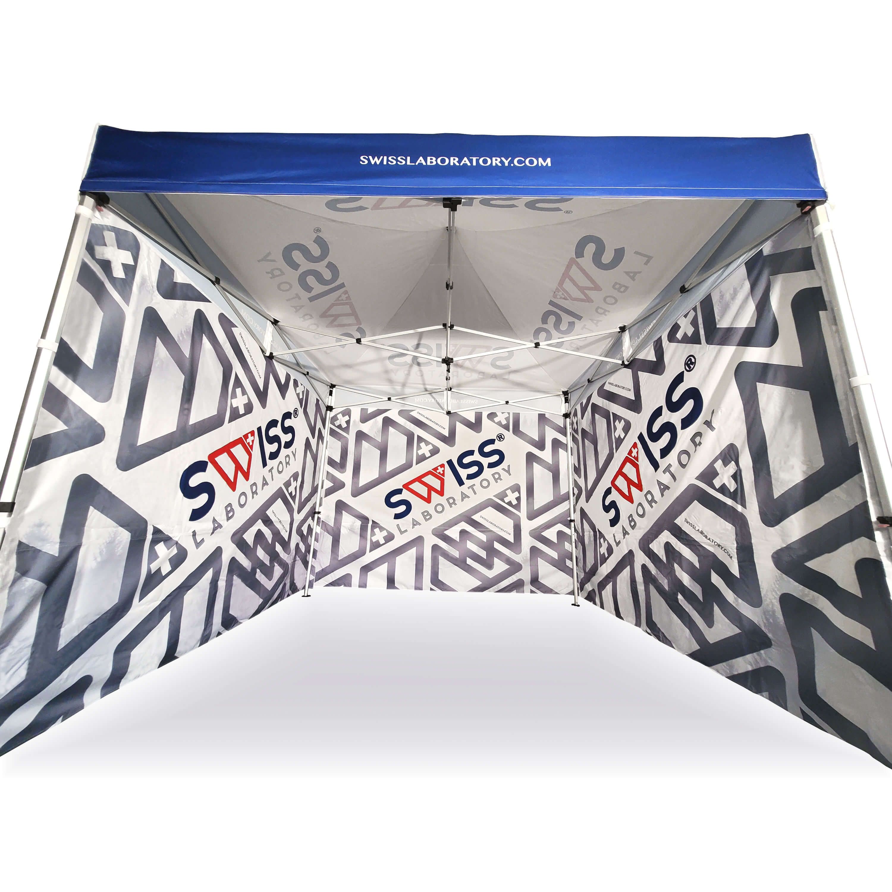 Reklamné stany s digitálnou sublimačnou tlačou. Tento proces sa uskutočňuje chemickou reakciou, kde atrament pod vysokou teplotou preniká priamo do štruktúry látky. Logo, text alebo akýkoľvek druh grafiky na vnútornej alebo vonkajšej strane stanu podľa želania zákazníka.